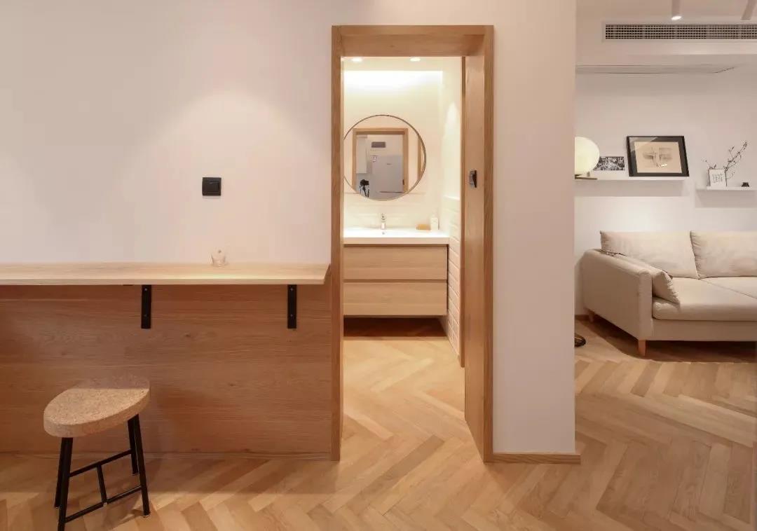 把衛(wèi)生間的洗手臺設計在門外,墻壁掛著圓形鏡子,白墻搭配原木色地板,十分文藝