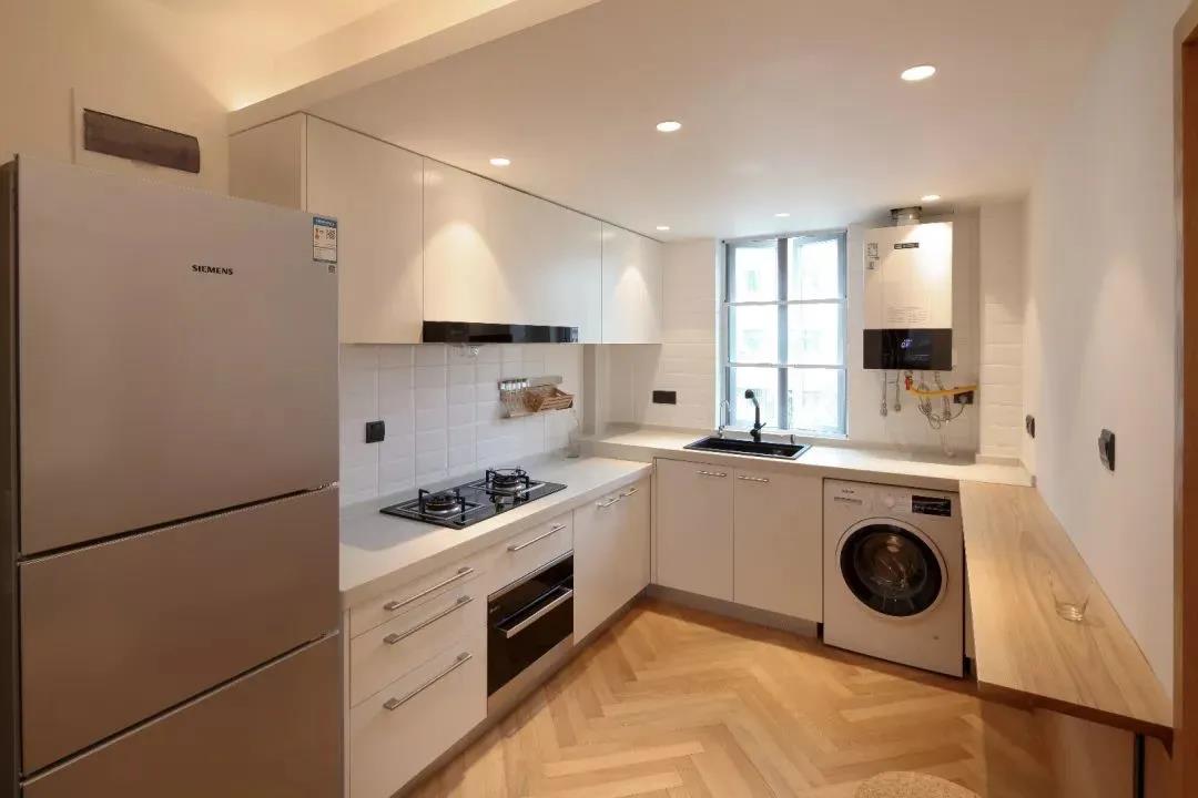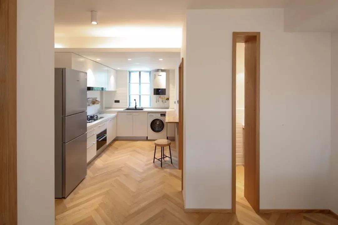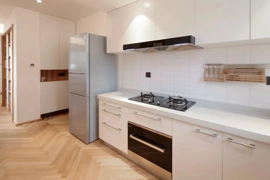 進門的左側是廚房,小房子的廚房面積不大,不過也能滿足基本的下廚需求,冰箱在鞋柜對面,巧妙的解決了沒有玄關的問題。