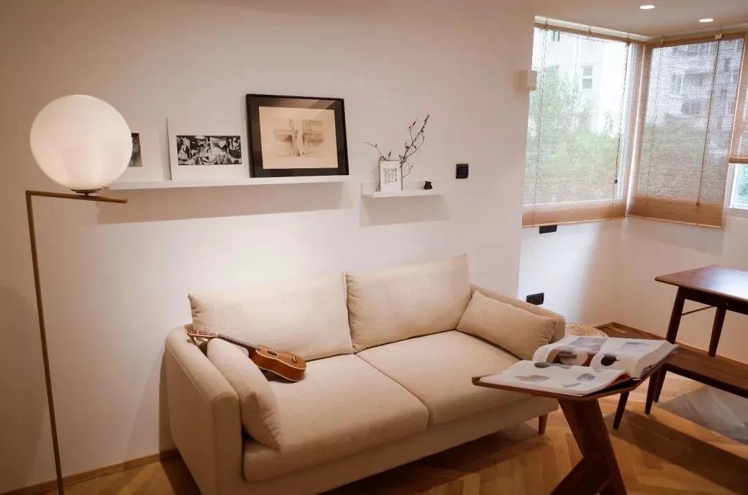 沙發(fā)墻裝上置物隔板,擺上自己喜歡的裝飾畫,可以提升整體的格調