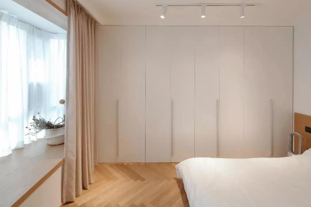 把臥室的一側墻面打造成衣柜,不經(jīng)意間加大了衣服的收納空間