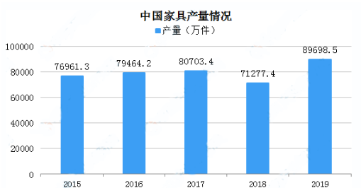 2013-2017年,我國(guó)家具行業(yè)產(chǎn)量呈增長(zhǎng)態(tài)勢(shì)。2018年國(guó)家對(duì)家具行業(yè)統(tǒng)計(jì)口徑進(jìn)行了調(diào)整,2018年規(guī)模以上企業(yè)家具產(chǎn)量為71277.4萬件,同比下降1.27%。2019年家具產(chǎn)量為89698.5萬件,同比下降1.36%。
