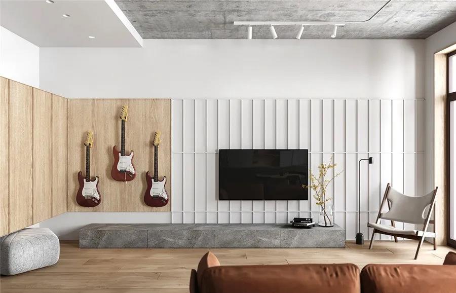 電視背景墻上的木飾面與白墻相互襯托