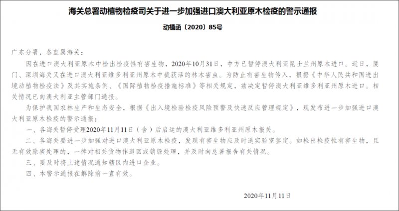 公告中還寫到,目前已經(jīng)依法要求各海關(guān)暫停受理2020年11月11日(含)后啟運(yùn)的澳大利亞維多利亞州原木報(bào)關(guān)。