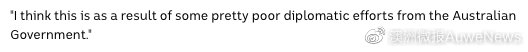 而來(lái)自澳大利亞建筑、林業(yè)、海事、采礦和能源工會(huì)(CFMMEU)事業(yè)部副主席布拉德·科茨(Brad Coates)也表示,“我認(rèn)為這是澳政府做出的相當(dāng)差的外交努力的結(jié)果?!?