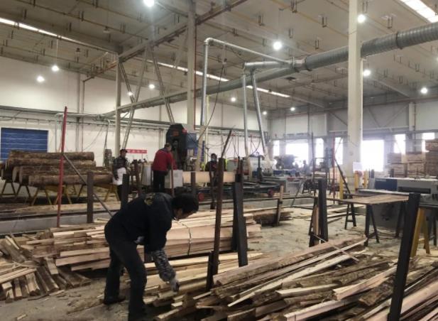 在進口原木加工倉庫內,幾名作業(yè)人員正將一塊原木段推進木工機械內對木頭段進行切片作業(yè),切開后的木塊再由小號的木工機械完成成品板材的切割,車間內共有6條生產線同時開工作業(yè),每條切割線均設有一條吸塵管道,將切割木材時所產生的鋸末吸干凈,車間內呈現一片繁忙的景象。