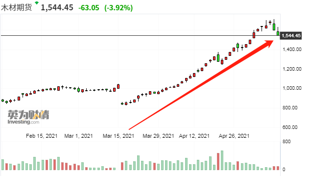 最近幾周,木材價(jià)格幾乎每天都在創(chuàng)新高,此前一度沖破每1000平方英尺1700美元,已經(jīng)較一年前翻了兩番。截至5月12日,美國(guó)木材期貨價(jià)格報(bào)每1000平方英尺1544.45美元。
