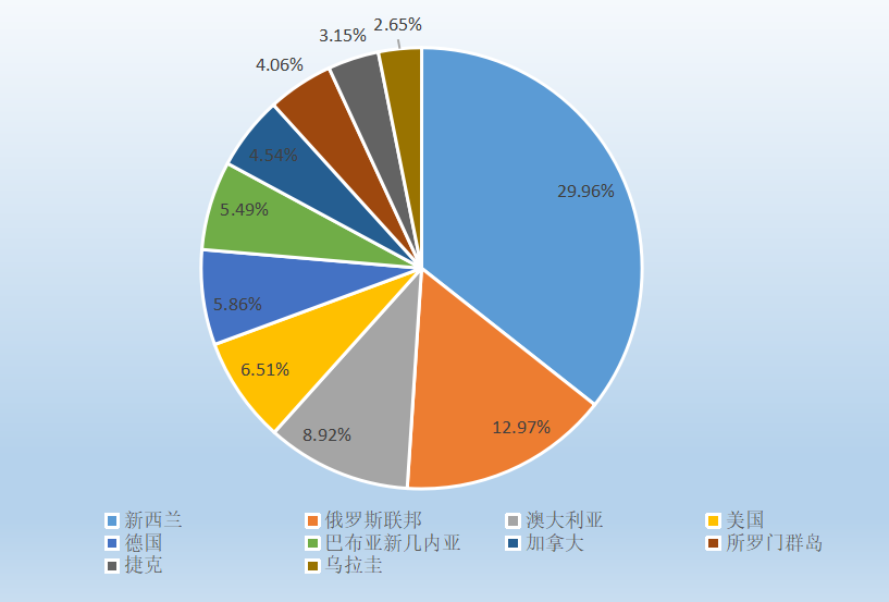 中國(guó)原木大量依賴進(jìn)口,進(jìn)口國(guó)家主要為新西蘭、俄羅斯、澳大利亞、德國(guó)、美國(guó)、加拿大等。