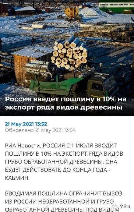 自俄羅斯去年9月宣布將于2022年停止出口未加工的原木材料后,今年5月俄羅斯政府新聞處(塔斯社)又傳來消息,俄政府同意自7月1日起至年底對多種粗加工木材出口征收10%的關(guān)稅。