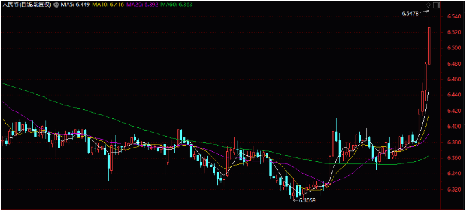 截至4月22日,在岸人民幣匯率報(bào)6.5009,日內(nèi)跌逾500個(gè)基點(diǎn),創(chuàng)去年8月來(lái)低位。更多反映國(guó)際投資者預(yù)期的離岸人民幣匯率報(bào)6.5292,盤(pán)中則接連跌破6.48、6.49、6.50、6.51、6.52、6.53和6.54共計(jì)7個(gè)關(guān)口,一度跌破6.54關(guān)口,日內(nèi)一度跌逾600個(gè)基點(diǎn),收創(chuàng)去年5月來(lái)低位。
