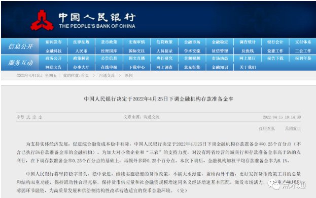 央行決定于2022年4月25日下調(diào)金融機(jī)構(gòu)存款準(zhǔn)備金率0.25個(gè)百分點(diǎn)(不含已執(zhí)行5%存款準(zhǔn)備金率的金融機(jī)構(gòu))。為加大對(duì)小微企業(yè)和“三農(nóng)”的支持力度,對(duì)沒有跨省經(jīng)營的城商行和存款準(zhǔn)備金率高于5%的農(nóng)商行,在下調(diào)存款準(zhǔn)備金率0.25個(gè)百分點(diǎn)的基礎(chǔ)上,再額外多降0.25個(gè)百分點(diǎn)。本次下調(diào)后,金融機(jī)構(gòu)加權(quán)平均存款準(zhǔn)備金率為8.1%。